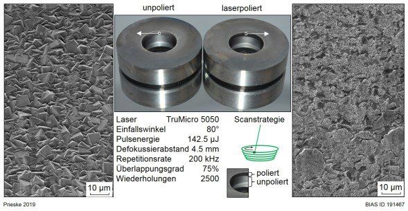 Aus wirtschaftlichen und ökologischen Gründen ist die Trockenumformung aufgrund der Verkürzung der Prozessketten, der Kosteneinsparungen und der Reduzierung der Umweltbelastung von zunehmendem Interesse. Ziel dieser Untersuchungen ist es, zu erforschen, inwieweit CVD-Diamantschichten für die Trockenumformung von Aluminium geeignet sind und die Anforderungen der Oberflächentopologie zu ermitteln, um einen niedrigen Reibungskoeffizienten und geringen Verschleiß zu erzielen. Durch eine Unterbrechung des Beschichtungsprozesses und ein Umdrehen der Umformmatrize, so dass die Plasmaflamme durch die andere Öffnung des Werkzeugs eintritt, konnte die Innenkontur eines 5 mm hohen Umformwerkzeugs inklusive Hinterschnitte mit einer CVD-Diamantbeschichtung einer homogenen Schichtdicke beschichtet werden. Auf Basis von oszillierenden Kugel‑Platte Tribometertests und Verjüngungsuntersuchungen konnte gezeigt werden, dass für die Realisierung von trockenen Stückgutprozessen mit Aluminiumwerkstoff, Diamantbeschichtungen ein großes Potential bieten. Es konnte ein Rauheitsparameter bestimmt werden, welcher gleichermaßen in der Lage ist, für unpolierte und mechanisch polierte CVD-Diamantschichten den Reibungskoeffizienten sowie die Verschleißrate des Aluminiumgegenkörpers im trockenen oszillierenden Kugel‑Platte Tribometertests vorherzusagen. Dieser Parameter ist das Spitzenmaterialvolumen (Vmp) und ist ein Maß für das Volumen der obersten 10 % der Oberfläche. Für trockene Stückgutprozesse von Aluminiumwerkstücken wird die Abscheidung von mikrokristallinen CVD-Diamantschichten mit anschließender Nachbehandlung der Oberfläche empfohlen, um ein Spitzenmaterialvolumen von weniger als 0,04 ml/m² zu erreichen, um den Verschleiß des Aluminiumgegenkörpers zu minimieren. Je niedriger der Vmp Wert, desto niedriger ist der Reibungskoeffizient für den trockenen Kontakt von Diamant mit Aluminium. Nanokristalline CVD-Diamantschichten bieten ein Potential für die trockene Umformung von Aluminium ohne die Notwendigkeit einer Nachbearbeitung, eignen sich jedoch eher für Prozesse wie das Drahtziehen, da sie einer wiederholten Haftreibung nicht standhalten. Für die Nachbehandlung von CVD-Diamantschichten wurde das Laserpolieren mit einem Pikosekundenlaser untersucht. Die Oberflächenrauheit konnte um 72,5% reduziert werden. Sobald eine Zugänglichkeit der CVD-Diamantbeschichtung gegeben ist, weist der Laserpolierprozess aufgrund der geringeren mechanischen Belastung, ein geringeres Risiko für ein Abplatzen der CVD-Diamantschicht auf, als beim mechanischen Polieren.